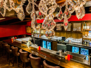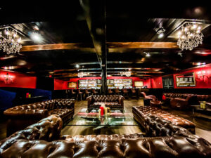 Killer Yacht Club is our speakeasy that lives just behind a moving wall of wine racks and is truly our location’s hidden gem. Opened in 2019, this venue has large, plush booths and oversized Timothy Alton chesterfield leather sofas, making every table VIP.