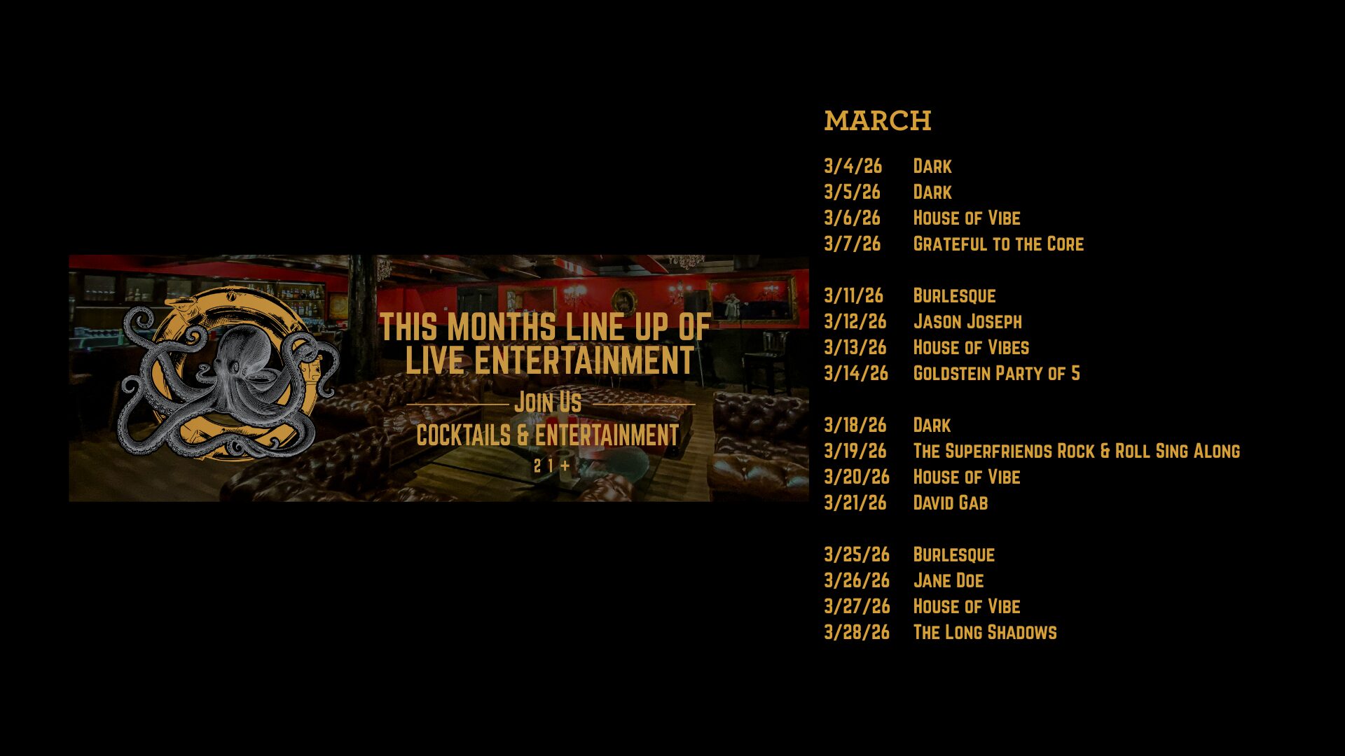 This intimate venue holds up to 99 guests and is perfect for private events, date nights and after-dinner cocktails with friends. We have live music Thursday through Saturday.